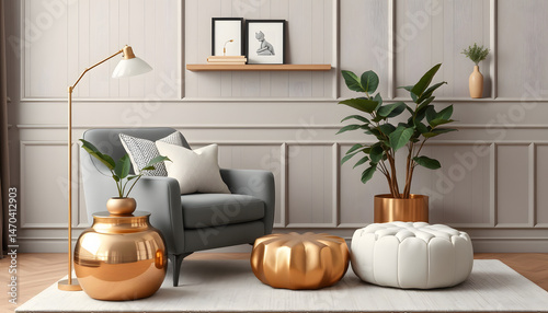 © Yusuf, Obraz premium Modern composition of living room with design gray armchair, gold pot with beautiful plant, pouf, pillows and elegant personal accessories. Wall panelling with shelf. Stylish home staging. Template,