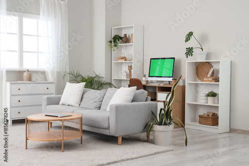 Fototapeta premium Modern computer with blank screen on table and laptop in living room