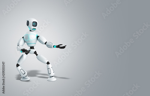 © nosorogua, Fototapeta premium modern concept of product presentation robot points to a thing standing nearby 3d render on grey