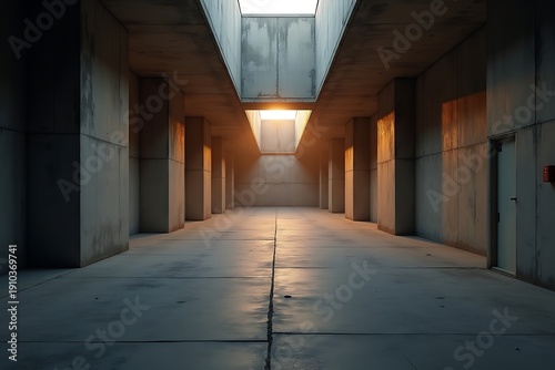© Fukuro, Fototapeta premium Modern Concrete Architecture with Dramatic Sunlight Illumination.