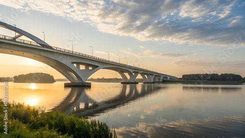 © SHR Visual Art , Fototapeta premium Modern concrete bridge spanning river at sunrise with calm water and cloudy sky