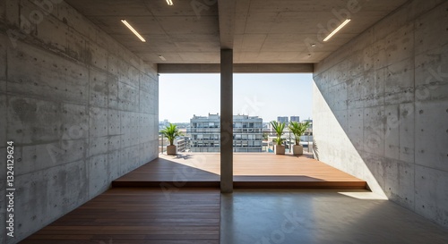 © Phung, Obraz premium Modern concrete building balcony bright sunlight serene view. AI Generated