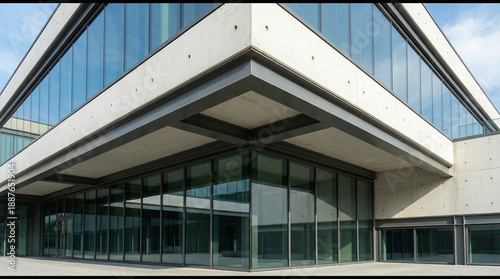 © Amity, Obraz premium Modern concrete building exterior with curved glass facade and geometric design