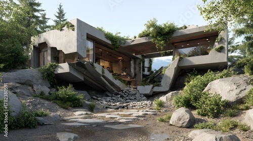 Obraz premium Modern concrete dwelling is dramatically integrated into a rugged, overgrown natural landscape