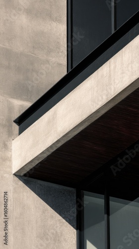 Fototapeta premium Modern concrete facade detail, dark window, overhang