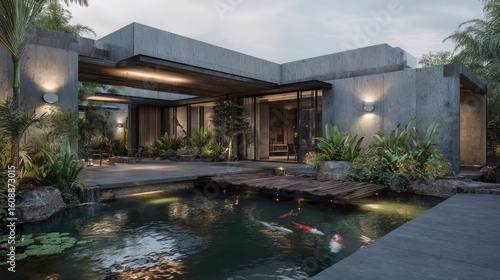 © sadad, Obraz premium Modern, concrete home with a koi pond and lush greenery. Evening ambiance