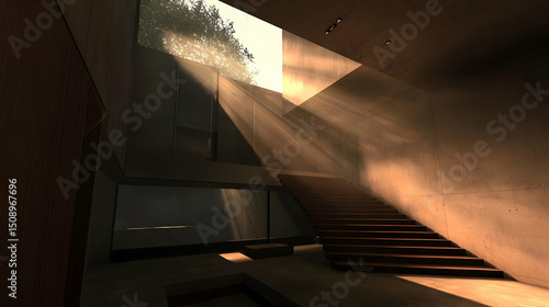 © Andri, Fototapeta premium Modern Concrete Interior With Wooden Stairs And Sunlight