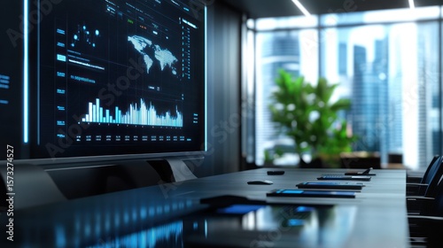 Fototapeta premium Modern conference room with large screen displaying data charts