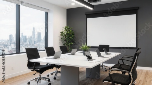 Fototapeta premium Modern conference room with large table, laptops, and cityscape view