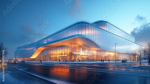 Obraz premium Modern construction building, sleek glass facade, workers using state-of-the-art equipment in a high-tech environment