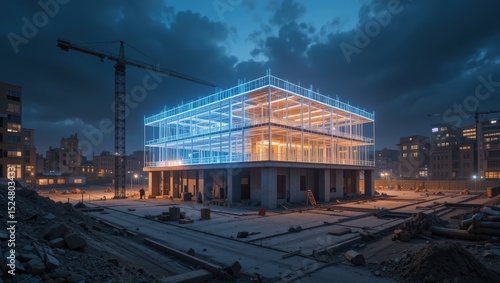 Obraz premium Modern Construction Site with Neon Lights Illuminating a Building at Night in...