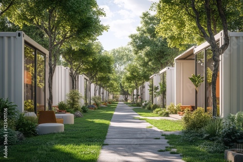 © Anha, Fototapeta premium Modern container homes nestled in a lush green landscape pathway leading to tranquil serenity