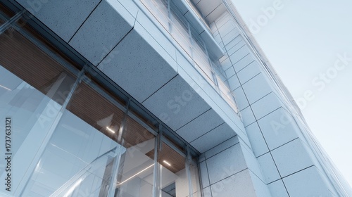 Obraz premium Modern contemporary building exterior with glass facade and textured panels.