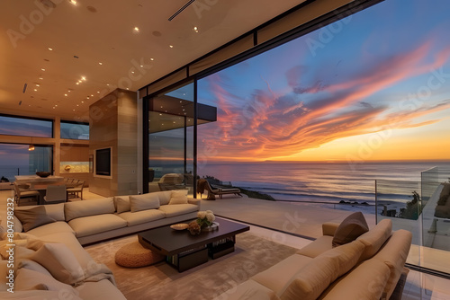 Fototapeta premium Modern contemporary illuminated house design exterior. Luxurious new construction home with panoramic windows, pool, patio