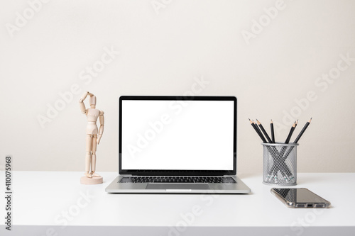 Fototapeta premium modern contemporary workspace with laptop computer, office stationery and supply on desk