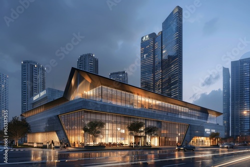 Naklejka premium Modern convention center with a striking glass facade stands prominently in a bustling urban city center, illuminated by the warm glow of dusk