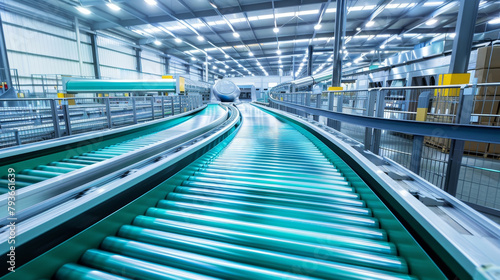 Fototapeta premium Modern conveyor belt system in a large-scale factory, with a bright light...
