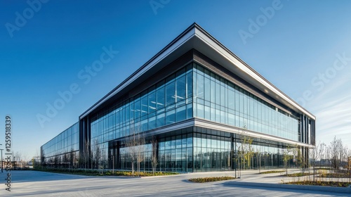 Obraz premium Modern Corporate Architecture: A Sleek Glass Building Under Clear Blue Skies