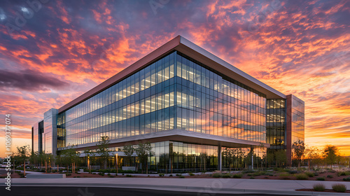 © CreativeCreations, Obraz premium Modern corporate office building captured from a low angle during a vibrant sunset, symbolizing business success, growth, and future development