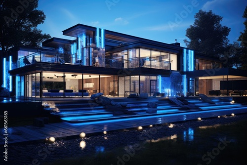 © Julia Jones, Obraz premium Modern country house with large windows and blue neon lighting
