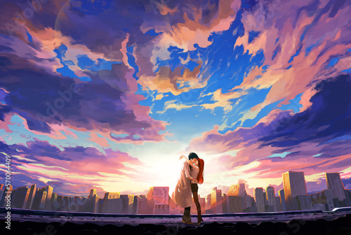 © Diganime, Obraz premium modern couple kissing on Valentines day under the beautiful sky in the city with buildings in background anime digital art illustration paint background wallpaper