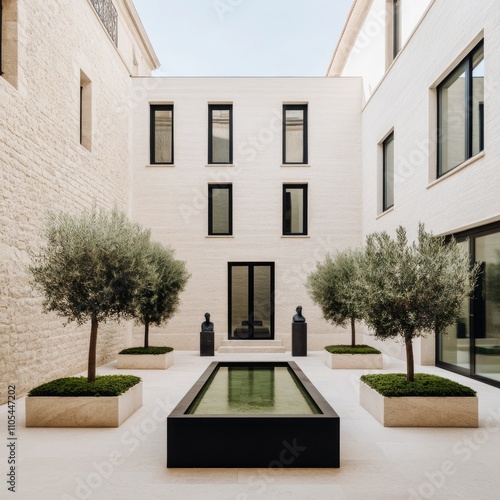 © Big9869, Obraz premium Modern courtyard with olive trees, reflecting pool, and minimalist architecture.
