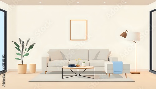 Fototapeta premium Modern Cozy Living Room with White Sofa, Plants & Vase - 16:9 Aspect Ratio