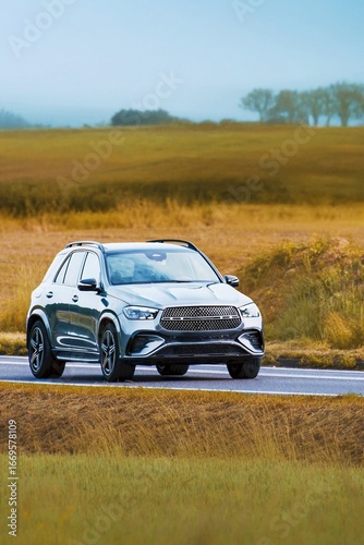 © AlexGo, Fototapeta premium Modern crossover SUV driving through green countryside