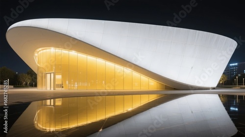 © meng, Obraz premium Modern Curved Building with Illuminated Facade at Night