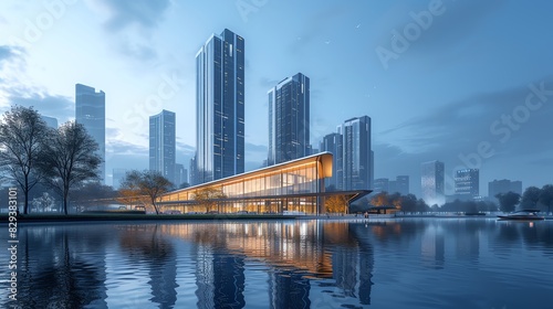 Naklejka premium Modern Curved Glass Building in Urban Skyline With Illuminated Windows At Dusk