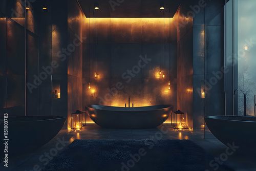 Fototapeta premium Modern Dark Bathroom Design, Luxurious Bathtub with Warm Lighting, Enhancing...