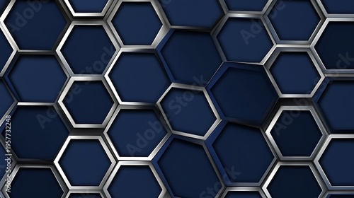 Fototapeta premium Modern dark blue and silver hexagonal pattern background with metallic edges and geometric design elements for digital art