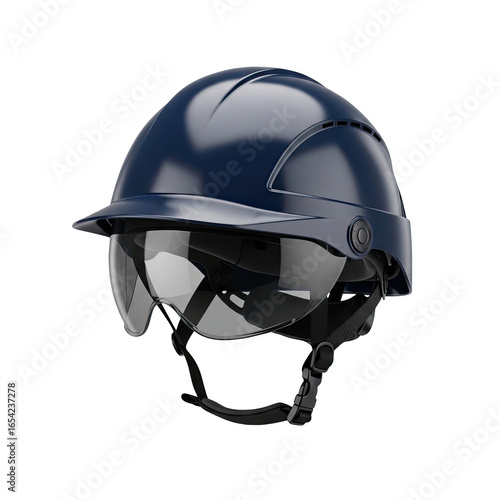 Fototapeta premium Modern dark blue industrial safety helmet with integrated visor for head protection isolated on transparent background