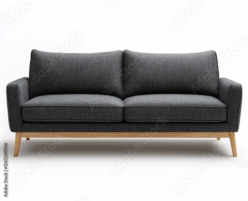 © BerkahStock, Fototapeta premium Modern dark gray fabric sofa with light wooden legs on white background.