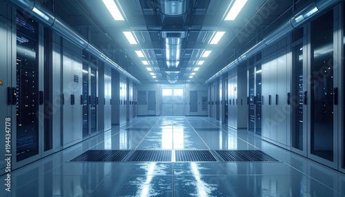 Fototapeta premium Modern Data Center Interior with Server Racks and Bright Lighting