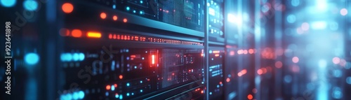 Obraz premium Modern data center server racks with glowing lights and network cables,...