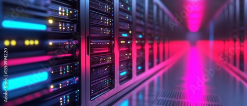 Obraz premium Modern Data Center with Colorful LED Lights Highlighting Rows of Server Racks...