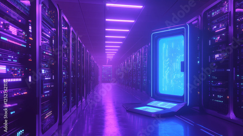 © Sehraye, Fototapeta premium Modern data center with computer servers. Vector cartoon illustration of dark room with information technology equipment for cloud storage, cyber security control, crypto mining, blue light portal