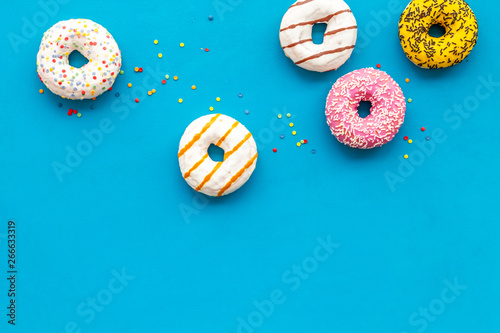 Naklejka premium Modern design with bright donuts on blue background top view mock up