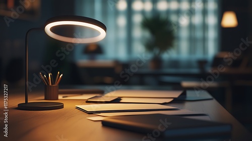 Obraz premium Modern Desk Lamp Illuminates Evening Workspace Documents
