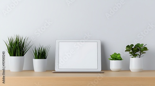 © naphat, Obraz premium Modern Digital Document Management Concept on Tablet with Eco-Friendly Green Plants on Wooden Desk
