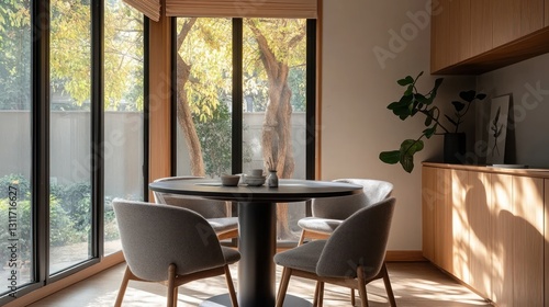 © lestari, Obraz premium Modern dining area with garden view, bright and airy. Use for interior design or home decor