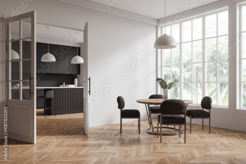 Fototapeta premium Modern dining area with large windows, connected to a stylish black kitchen...