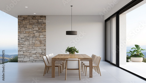 Fototapeta premium Modern dining area with ocean view, featuring minimalist design, natural elements, and abundant sunlight.