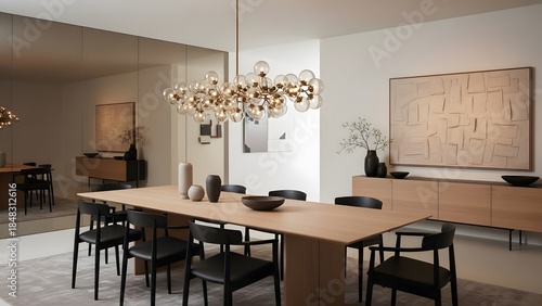 © Vita, Fototapeta premium Modern Dining Room Interior with Stylish Chandelier and Artwork.