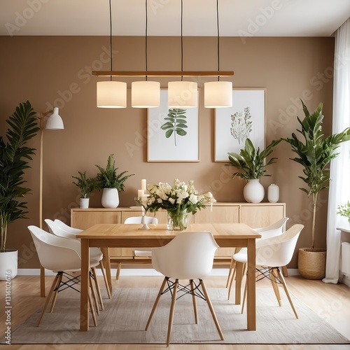 © Liang, Fototapeta premium Modern Dining Room Interior with Wooden Table and White Chairs
