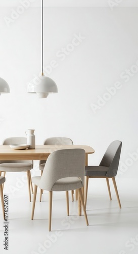 Fototapeta premium Modern dining room setting features wooden table and upholstered seating...