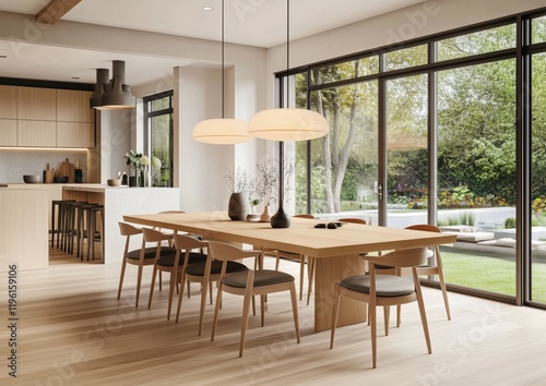 Fototapeta premium Modern Dining Room with Natural Light and Minimalist Decor, Inviting Family Gatherings