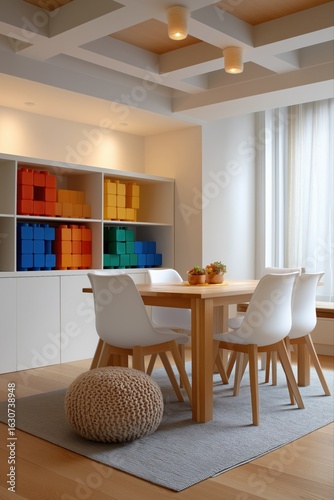 © Iryna, Fototapeta premium Modern dining room with wooden table and colorful shelving in bright interior