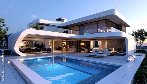 Fototapeta premium Modern Dream Home Poolside Luxury Contemporary Architecture at Sunset.